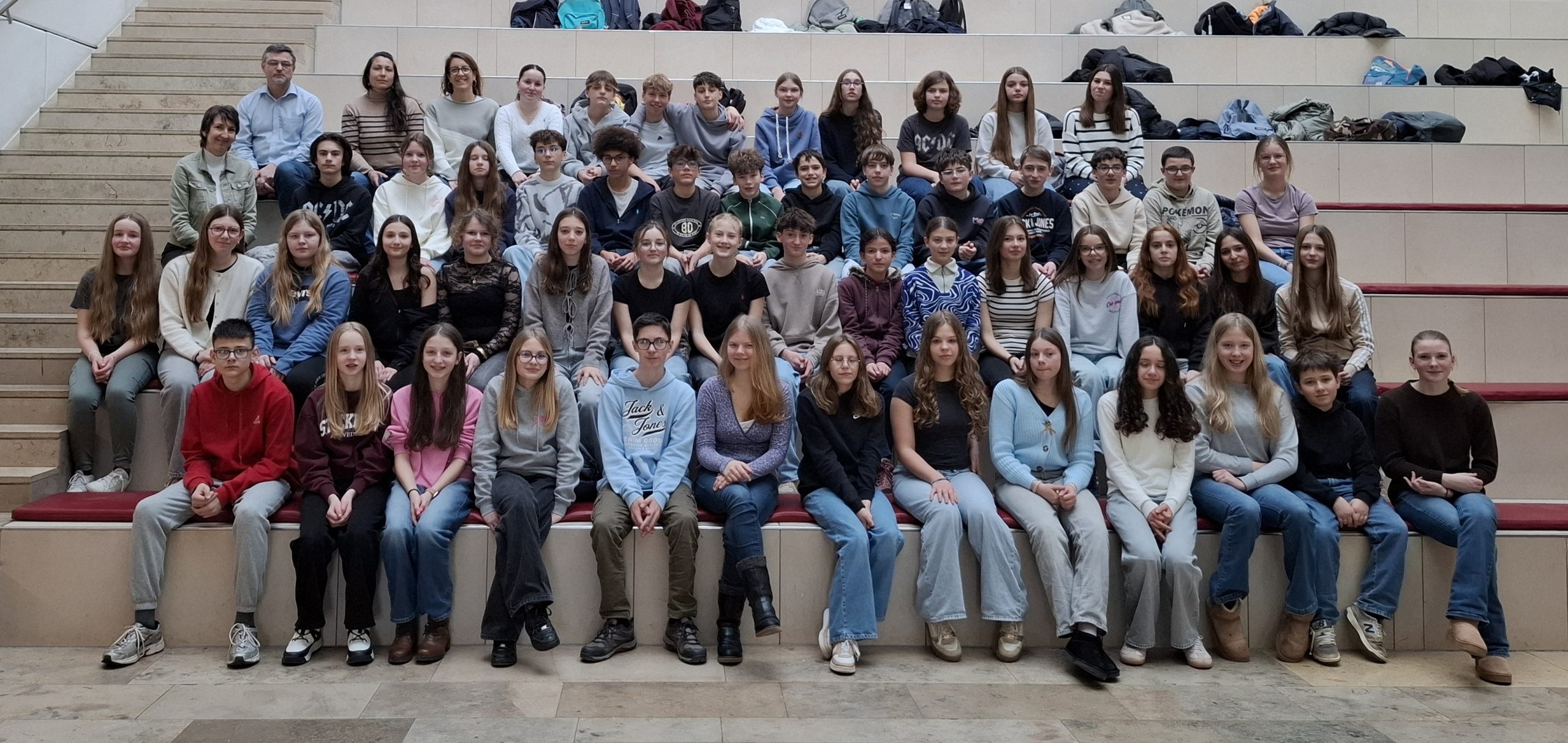 In den ersten beiden Schulstunden besuchten die französischen Gäste sowie ihre Lehrerinnen Heloise Meunier, Charlotte Bourdil und Marion Fontaine verschieden Klassen, sahen sich den deutschen Unterricht an und beantworteten Fragen der interessierten Gymnasiasten. Danach versammelten sich die Jugendlichen in der Aula, wo sie von Schulleiter Oberstudiendirektor Martin Friedl begrüßt wurden und ihnen eine Schülergruppe das abwechslungsreiche Wochenprogramm vorstellte.
