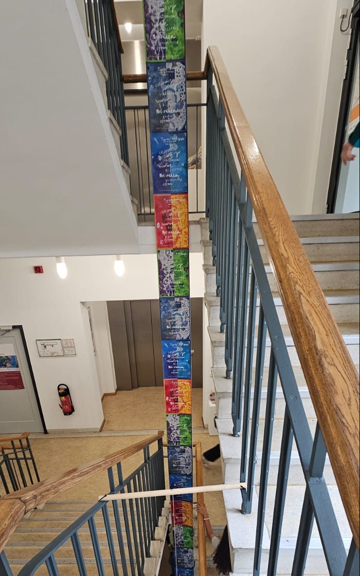 Das Projekt mit dem Titel „Verbindungslinien“ wurde von Tanja Pfeffer (Mittelschule) und Britta Wahlers (Gymnasium) initiiert. Mit viel Engagement entwickelten die beiden Lehrkräfte die Idee, Schüler beider Schulen durch Kunst zusammenzubringen. Ziel war es, kreative Ausdrucksformen zu fördern und den Austausch sowie die Gemeinschaft zwischen den Schulen zu stärken. Die im Lauf des vergangenen Schuljahres entstandene Verbindung ist nun für ein Jahr an der Universität sichtbar. Auf einem 10 Meter langen Banner spannen sich die „Verbindungslinien“ über mehrere Stockwerke eines Treppenhauses.