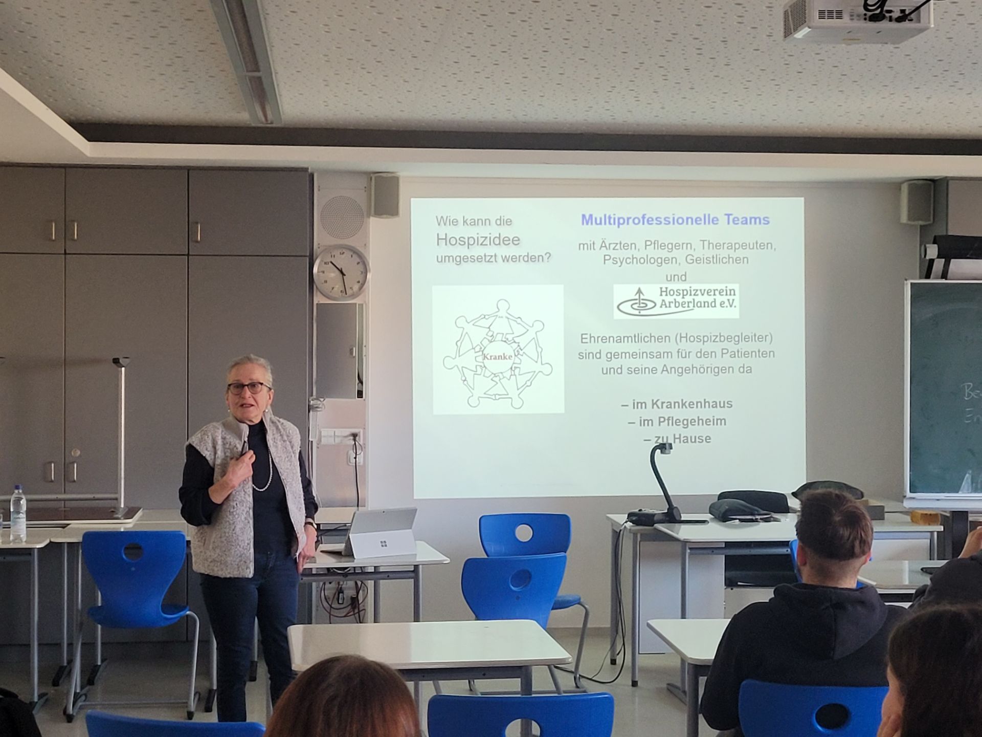 Passend zum Lehrplanthema „Tod und Auferstehung“ stellte Frau Heidemarie Horenburg für die 10. Klassen ihre Arbeit im Hospizverein Arberland vor. Der Verein ist seit 1999 aktiv und 80 ehrenamtliche Mitarbeiter begleiten sterbende Menschen auf ihrem letzten Weg. Mittlerweile hat die Organisation ein Büro in Viechtach und Zwiesel zur Koordination, während die Begleitung der Kranken in Form von Hausbesuchen erfolgt.