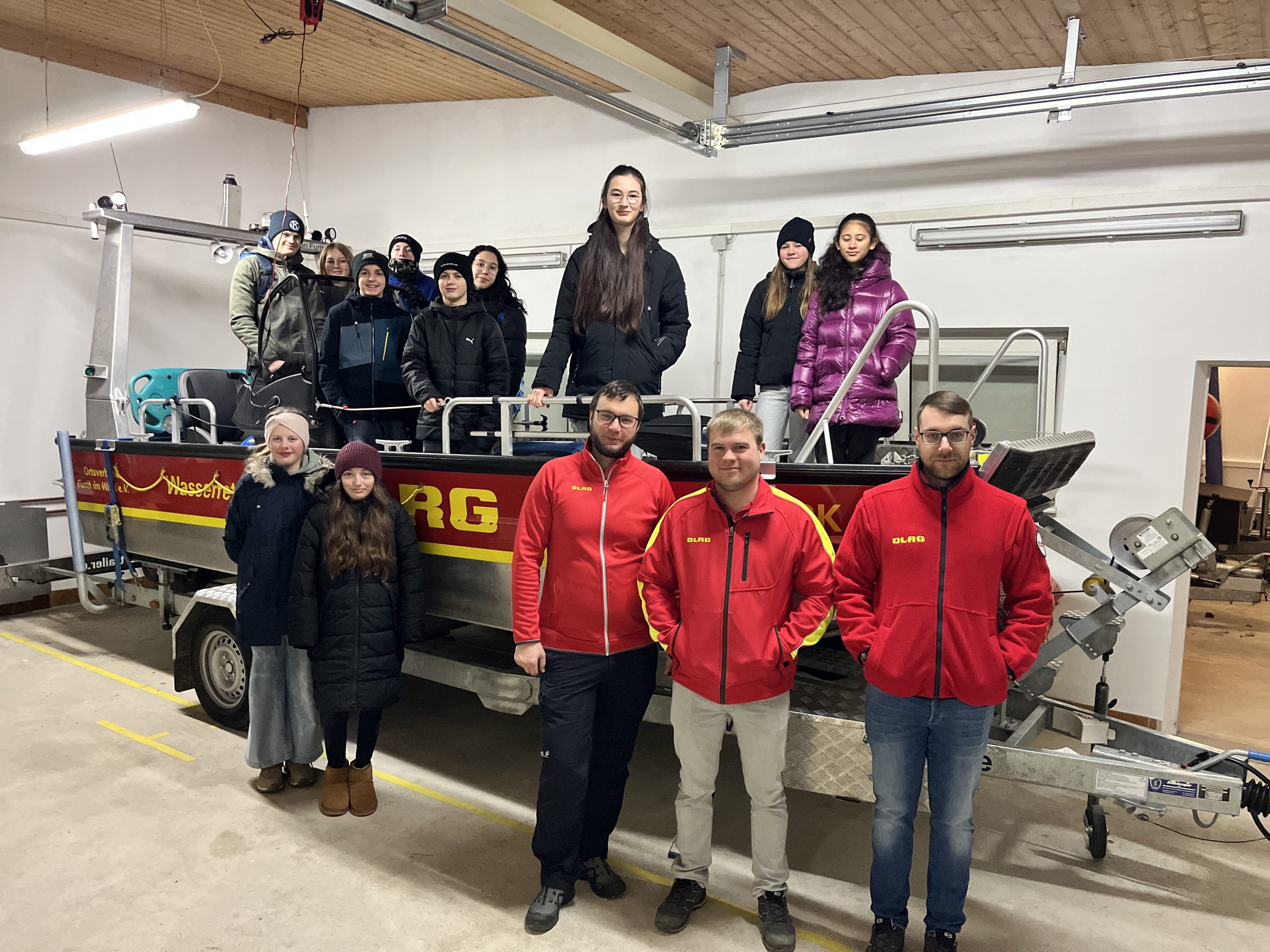 Am Abend stand ein weiterer Höhepunkt auf dem Programm: ein Besuch bei der DLRG, die ebenfalls in Furth im Wald angesiedelt ist. Besonders gut gefiel es den Schülern die Boote zu erkunden sowie hautnah vorgeführt zu bekommen, wie Personen, die im Eis eingebrochen sind, mithilfe eines aufblasbaren Rettungsschlittens sicher geborgen werden können. Der Vorsitzende, Tobias Kögler, informierte die Gruppe über die vielfältigen Aufgaben und Einsatzgebiete der DLRG.
