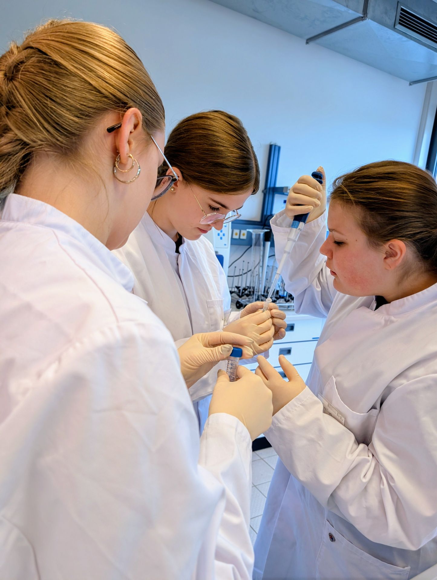 Im Zentrum des Workshops „Puzzeln mit dem Code des Lebens – Biomedizinische Datenanalysestand“ stand die Isolierung von RNA – ein grundlegender Schritt der molekularbiologischen Forschung. Nach einer kurzen Einführung von Frau Prof. Dr. Kappelmann-Fenzl in die theoretischen Grundlagen durften die Schülerinnen und Schüler selbst aktiv werden: Mit Laborkitteln, Pipetten und Zentrifugen ausgestattet, isolierten sie unter Anleitung von Dr. Fischer RNA aus schwarzen Hautkrebszellen.