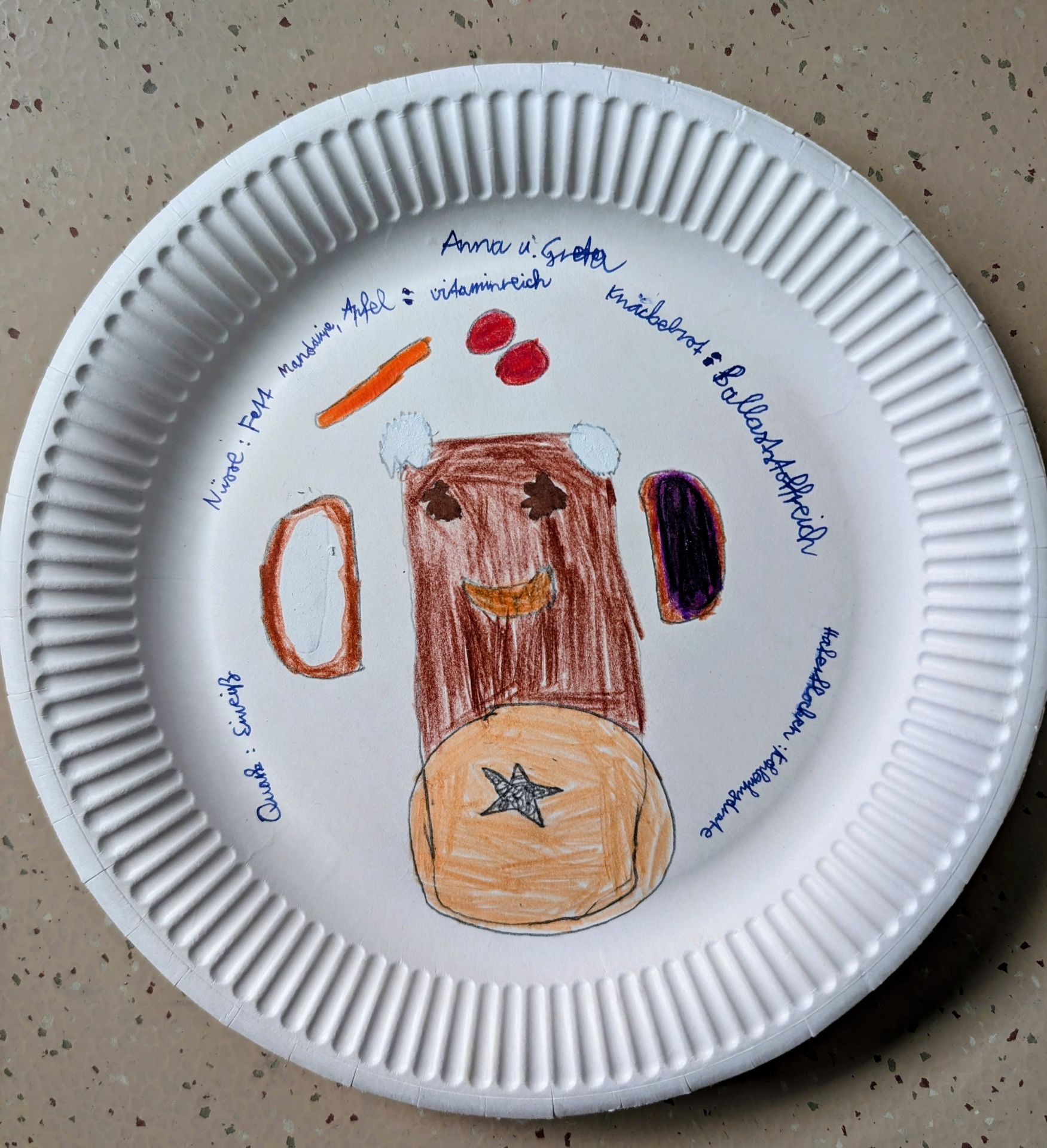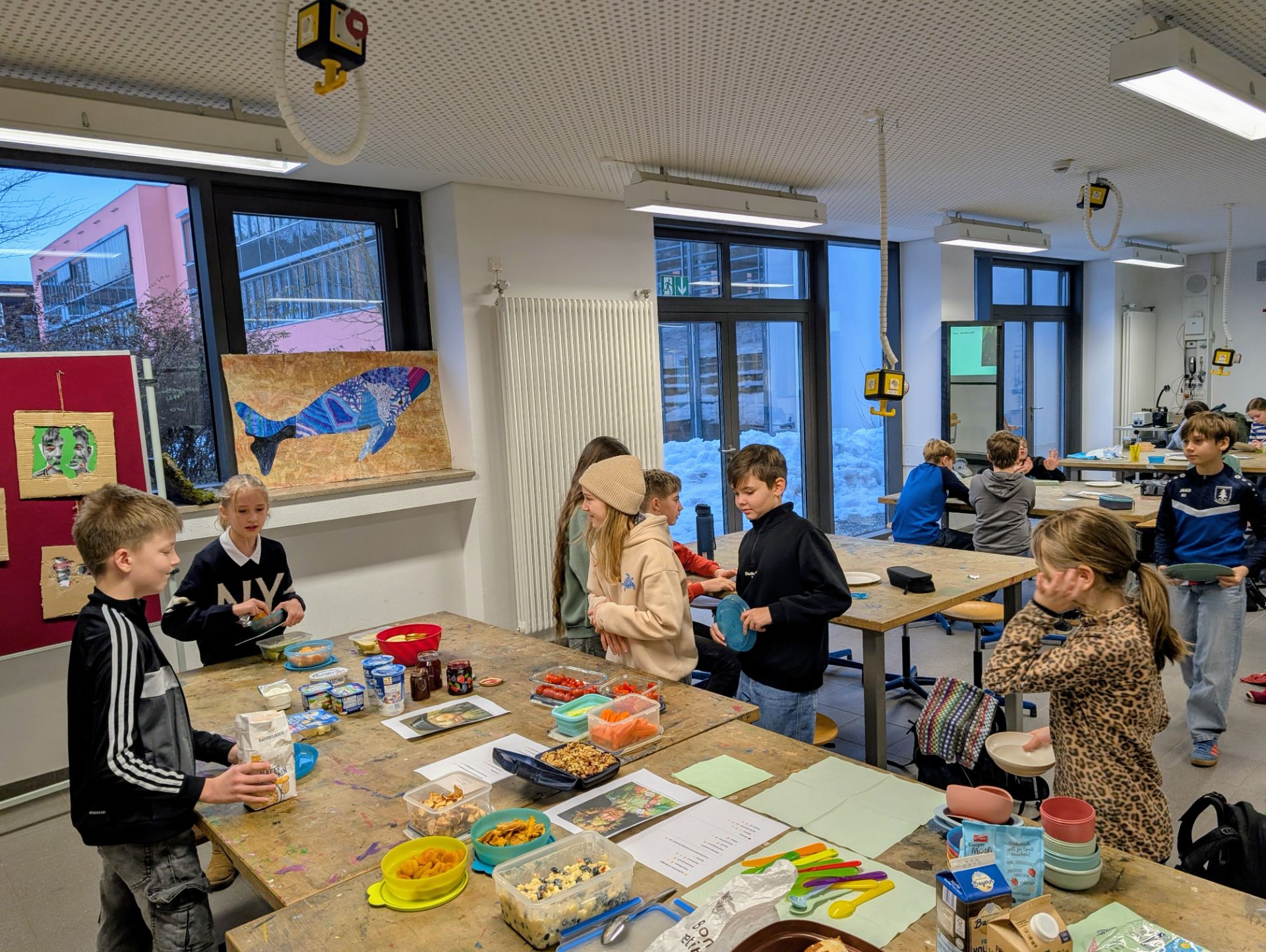 Bei einem gemeinsamen Frühstück durfte sich jeder Schüler von den mitgebrachten Lebensmitteln einen Teller zum Essen zusammenstellen, auf dem sich kohlenhydrat-, fett- und proteinhaltige Kost befand. Anschließend wurden die Teller abgezeichnet und die Zeichnungen im Schaukasten ausgestellt. Nach einem leckeren und vielseitigen Frühstück konnte die Klasse gestärkt in den weiteren Unterrichtsvormittag starten.