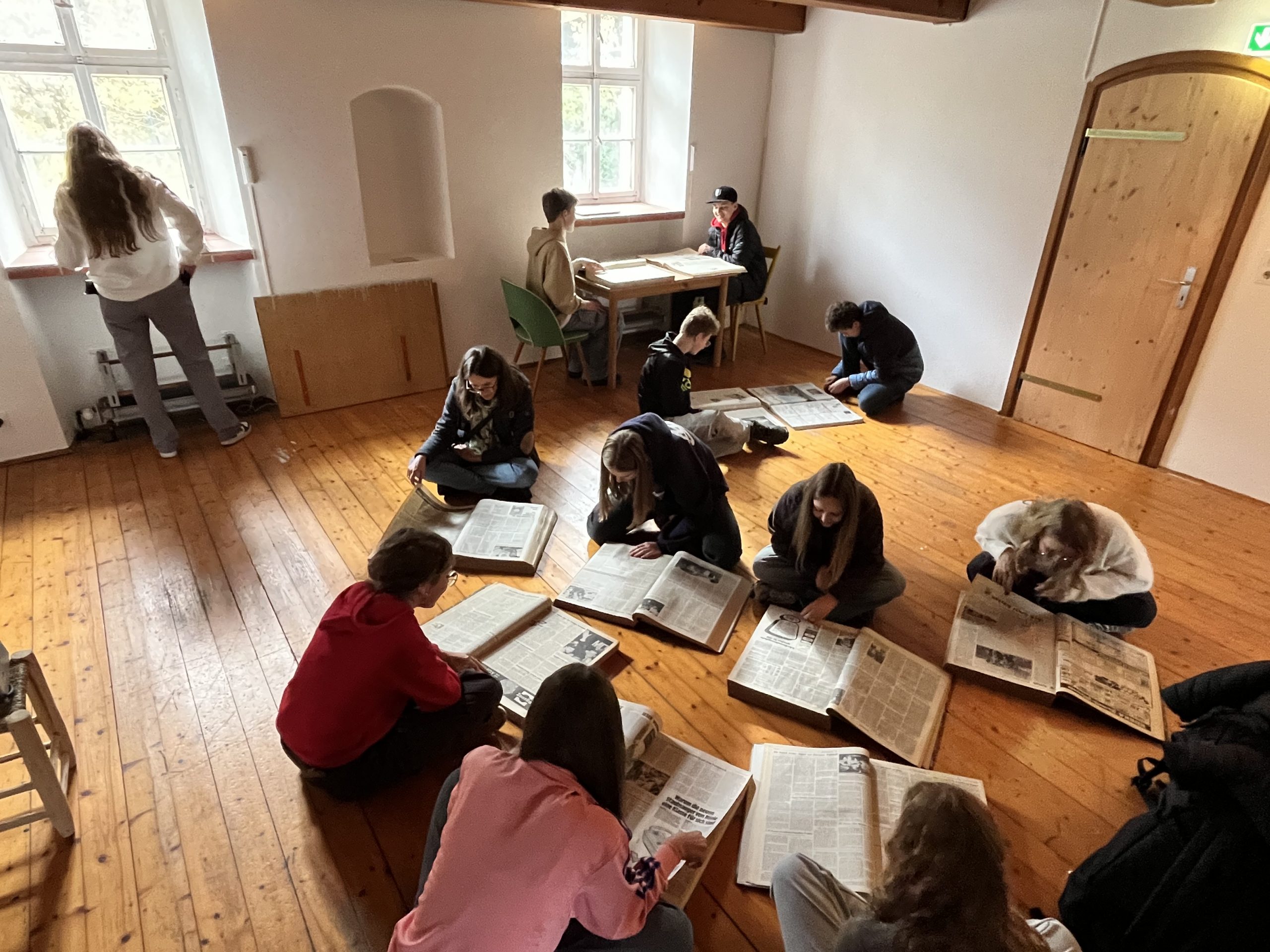 In der Regel liest man Zeitungen ja tagesaktuell – doch beim Besuch im Zeitungsarchiv der Stadt Viechtach stöberten die Schülerinnen und Schüler der ILV (9. Jgstf) in Ausgaben aus den letzten 70 Jahren! Bis ins Jahr 1950 reichen die gesammelten Ausgaben des Viechtacher Bayerwaldboten, die uu großen Bänden gebunden im Obergschoss des „Alten Spitals“ lagern und von Ruth Haimerl, Archivarin der Stadt, gehütet werden.