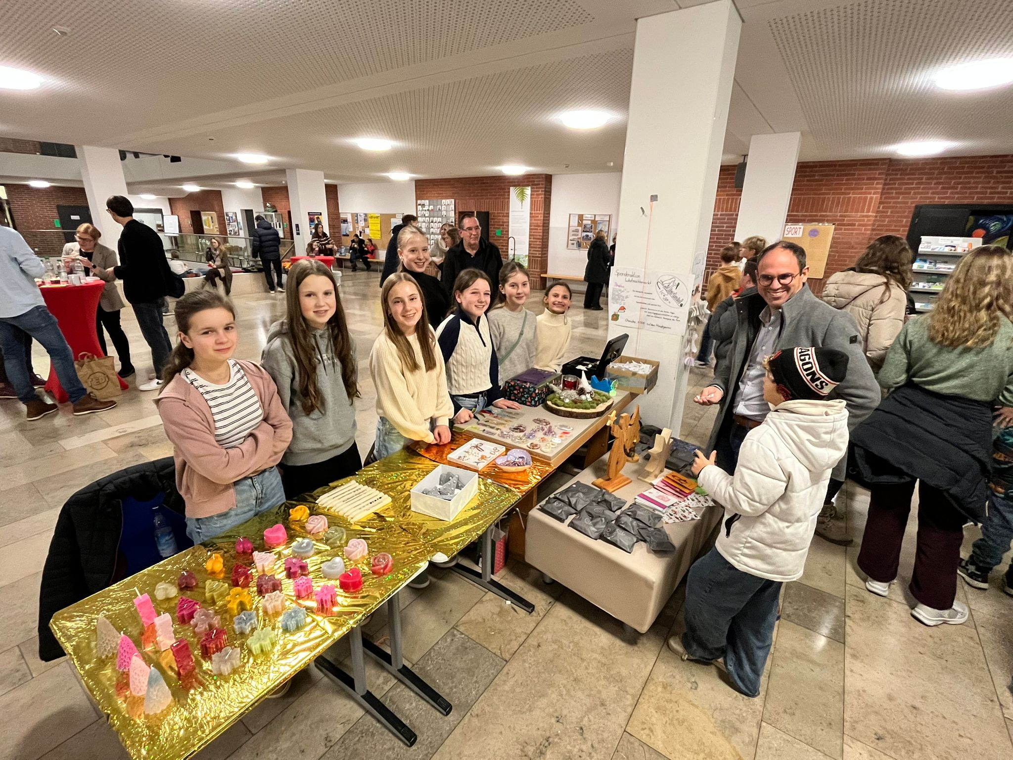 Das kulinarische Angebot ließ ebenfalls nichts zu wünschen übrig: Von Sengzelten, Würstelsemmeln, Kartoffelsuppe und Chili con Carne bis hin zu frischen Waffeln, Schokofrüchten und gebrannten Mandeln war für jeden Geschmack etwas dabei. Zu einem typischen Weihnachtsmarkt gehören auch künstlerische Handarbeiten. Diese wurden in der Aula der Schule von fleißigen Schülerinnen und Schülern ausgestellt und zum Verkauf angeboten. Neben individuell gestalteten Weihnachtskarten oder Produkten aus Bienenwachs fand auch Weihnachtsdekoration guten Absatz.