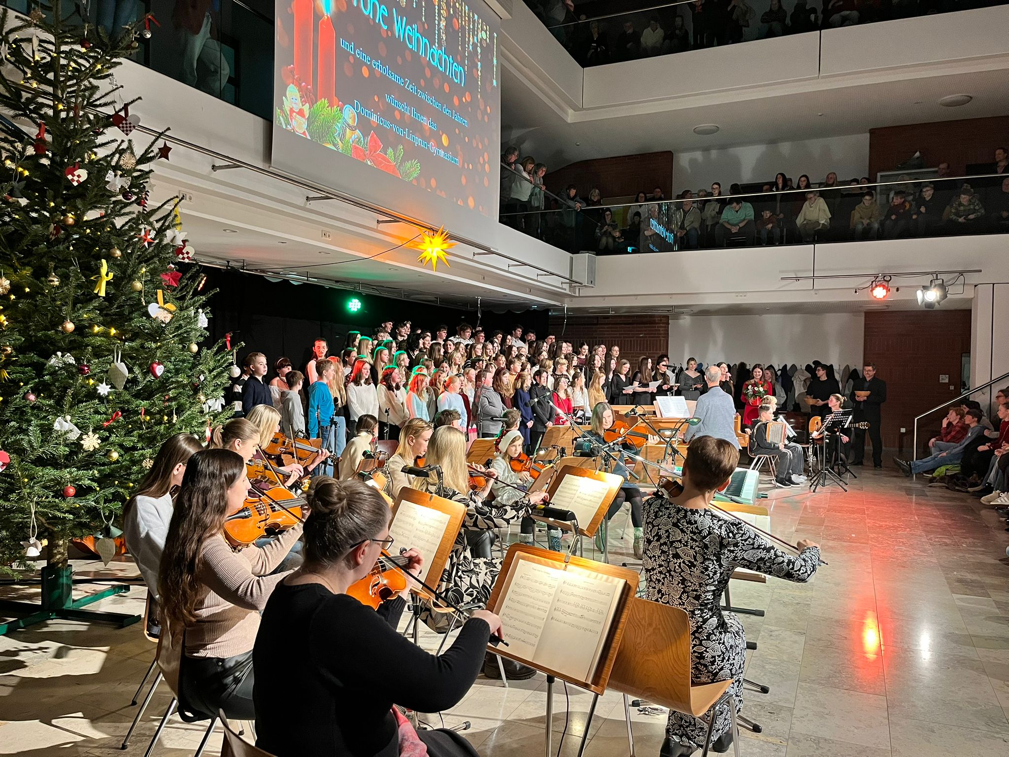 Advent ist die Zeit des Jahres, die ganz im Zeichen der Ruhe, Besinnlichkeit und der Vorfreude auf Weihnachten steht. Dass dies meist nichts mit der Realität zu tun hat, wissen viele. Oft ist es die stressigste Zeit im Jahr, vom Besorgen der Geschenke bis hin zur Suche nach dem passenden Christbaum. Eine liebgewonnene Tradition zum Ende dieser Zeit ist am Dominicus-von-Linprun- Gymnasium das Weihnachtskonzert in Kombination mit einem kleinen „Christkindlmarkt“: der DvL-Weihnachtszauber. Diese Veranstaltung kennzeichne für viele Schüler und Lehrkräfte den Beginn des Weihnachtsfriedens in der Schule nach einer anstrengenden Phase voller Leitungserhebungen, brachte Schulleiter Martin Friedl seine Vorfreude zum Ausdruck. Entsprechend viele waren gekommen, um sich in Weihnachtsstimmung bringen zu lassen: Die Aula war weit über die verfügbaren Plätze hinaus besetzt, bis in den obersten Stock standen die Gäste am Geländer und lauschten den weihnachtlichen Klängen des Konzertes.