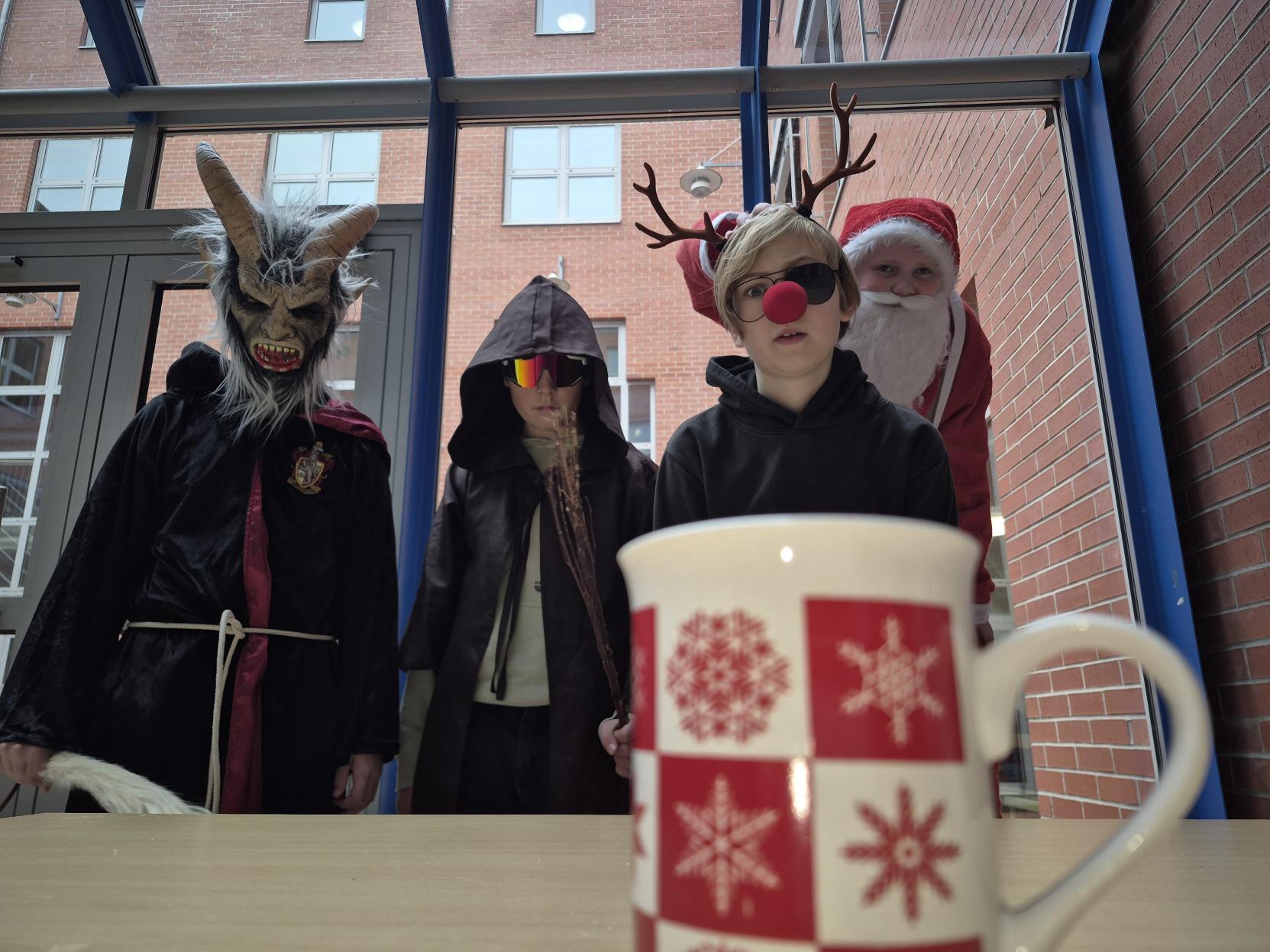 Humorvolle Momente steuerte die Theatergruppe der fünften und sechsten Klassen mit drei weihnachtlichen Spielszenen bei: Die 27 Kinder hatten sich mit viel Spielfreude und Kreativität unter der Leitung von Eva Maria Zeitlhöfler (10b), Sebastian Hofbauer und Corinna Schürzinger einiges einfallen lassen. So wurde pantomimisch ein imaginärer Christbaum aufgebaut und geschmückt, in dem eine große Spinne entdeckt wurde. Und nach der „artig oder unartig“-Prüfung durch Santa, Rentier Rudi, Christkind und Gefährten wurden schließlich die Geschenke ausgepackt: zur großen Freude eine Matte zum Turnen sowie ein Gutschein für ein wundervolles Weihnachtskonzert und ein bisschen Frieden.